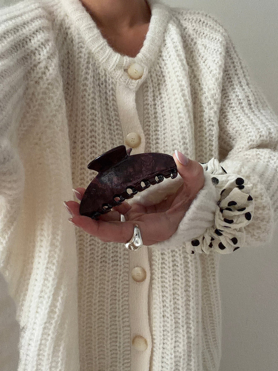 Die große Haarklammer MATILDA ist ein Allrounder und kommt in knalligen Farbvarianten sowie in cremigem Coffee. Girls mit mitteldickem Haar können sie für einen Full Bun verwenden, aber auch mit feinem Haar kann sie aufgrund ihres festen Halts gut getragen werden.